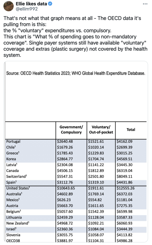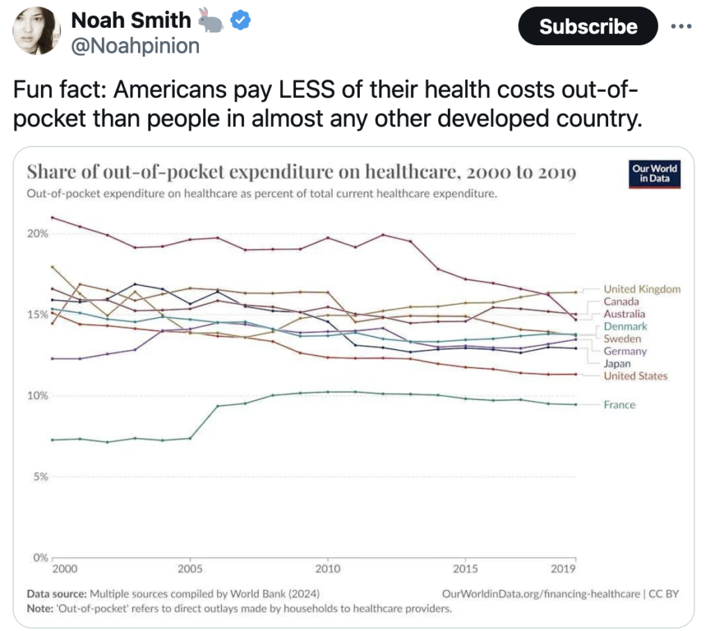 Which is a completely different thing. In reality, Americans pay far more out of pocket for far worse outcomes. Why does Noah seem to enjoy lying about stuff like this? What does it get him? I mean, what is the point?