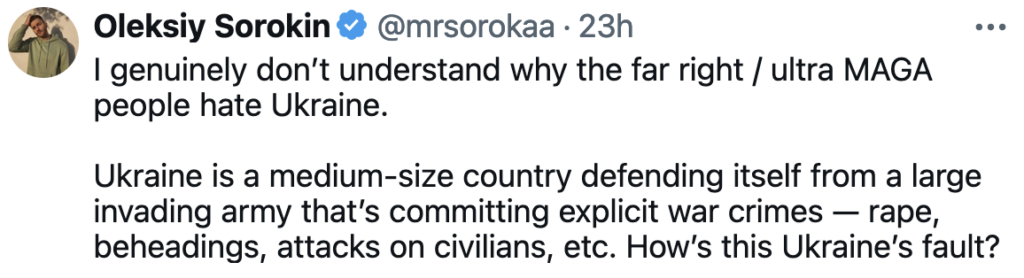 Itโs not just the MAGA right. Itโs a lot of left and even many โsoftโ liberals. For some inexplicable reason they hate Ukraine with the fire of a thousand suns, believe the Ukrainian people should be exterminated, and that Putin is a figure to be worshipped (and itโs all NATOโs fault, somehow).