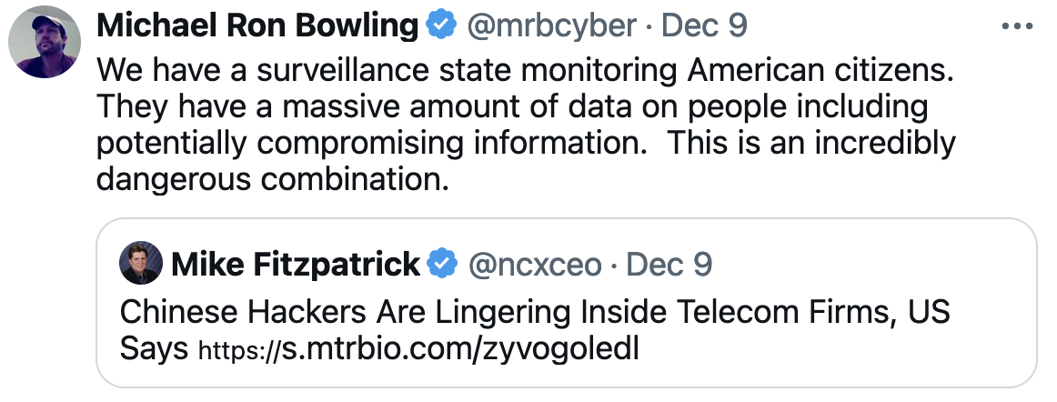 Monitore December 11, 2024, 5:44 AMDecember 11, 2024, 6:13 AM Chill Rant Itโs bad enough us surveilling our own citizens. But letting the CCP do it with near-impunityโฆare we just trying to lose or what?