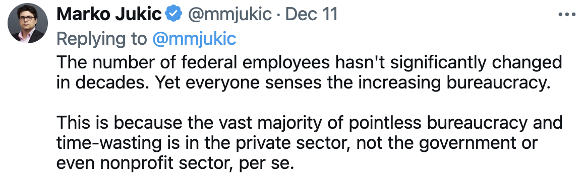 Correct. I see people complain about “government bureaucracy” fairly frequently — and it’s a private company they’re carping about. And then some claim the bureaucratic whirlwind is due to “regulations” when the supposedly-responsible regulations haven’t changed for 30, 40, or 50+ years.