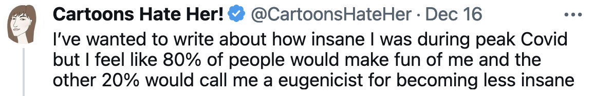 Sheโs the only person Iโve seen who actually admits they went insane during Covid. Most who did never recovered and if they did get better, never admitted they were once lost to nuthoodย Itโs so weird that the Covidians still fervently insist there were no lockdowns anywhere and that nothing was different because of Covid, while bleating about how terrible it all was a few seconds later.