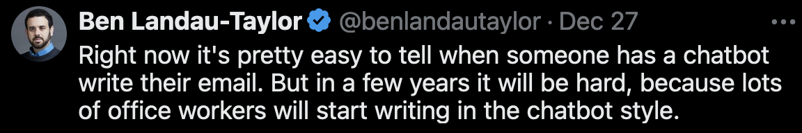 This is already happening. One of my team members did his year-end self-review. I read it (am his manager) and it seemed like it sounded AI-ish. I asked him if heโd used AI to create it and he said he hadnโt, though I know he uses ChatGPT for other things. Heโs honest and I believe him that he didnโt use AI for this particular item. But the review is written in that style, likely because he has been using AI for other mundane tasks so it has lodged in his brain. Iโve also seen the same in emails from other people that Iโm pretty sure were not actually AI-generated.