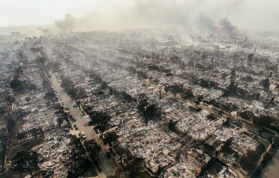 Drone shot of a Pacific Palisades neighborhood, where houses start at about $5 million: