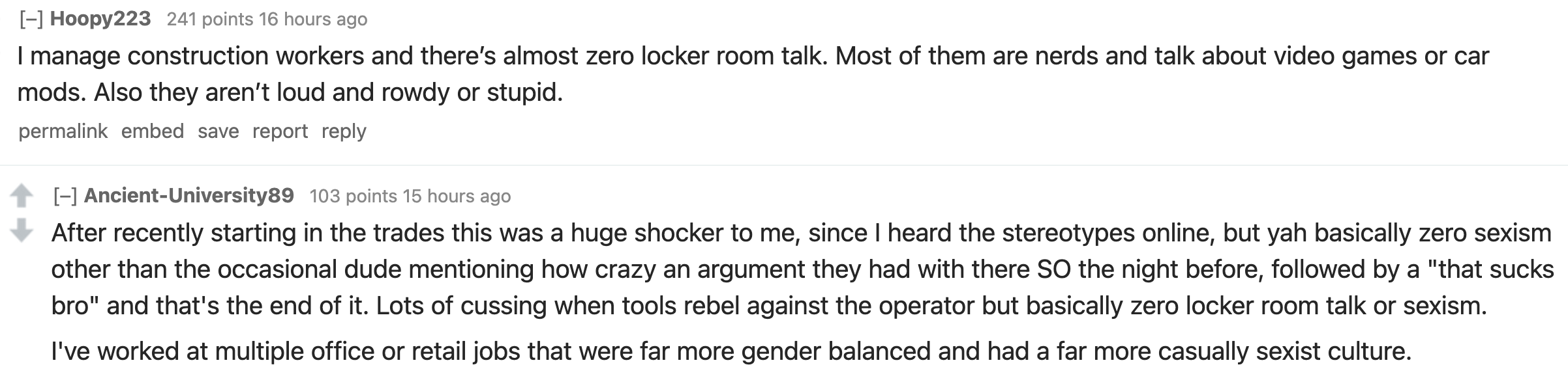 I was in the army for five years. I never witnessed any “locker room” talk at all. The closest I ever heard was something like, “Rebecca was hot! I hope she likes me.” Or something of that nature. Most of it was so vanilla and anodyne. And unlike in high school, in the army I was popular and well-liked. So it wasn’t like I was being excluded, etc.