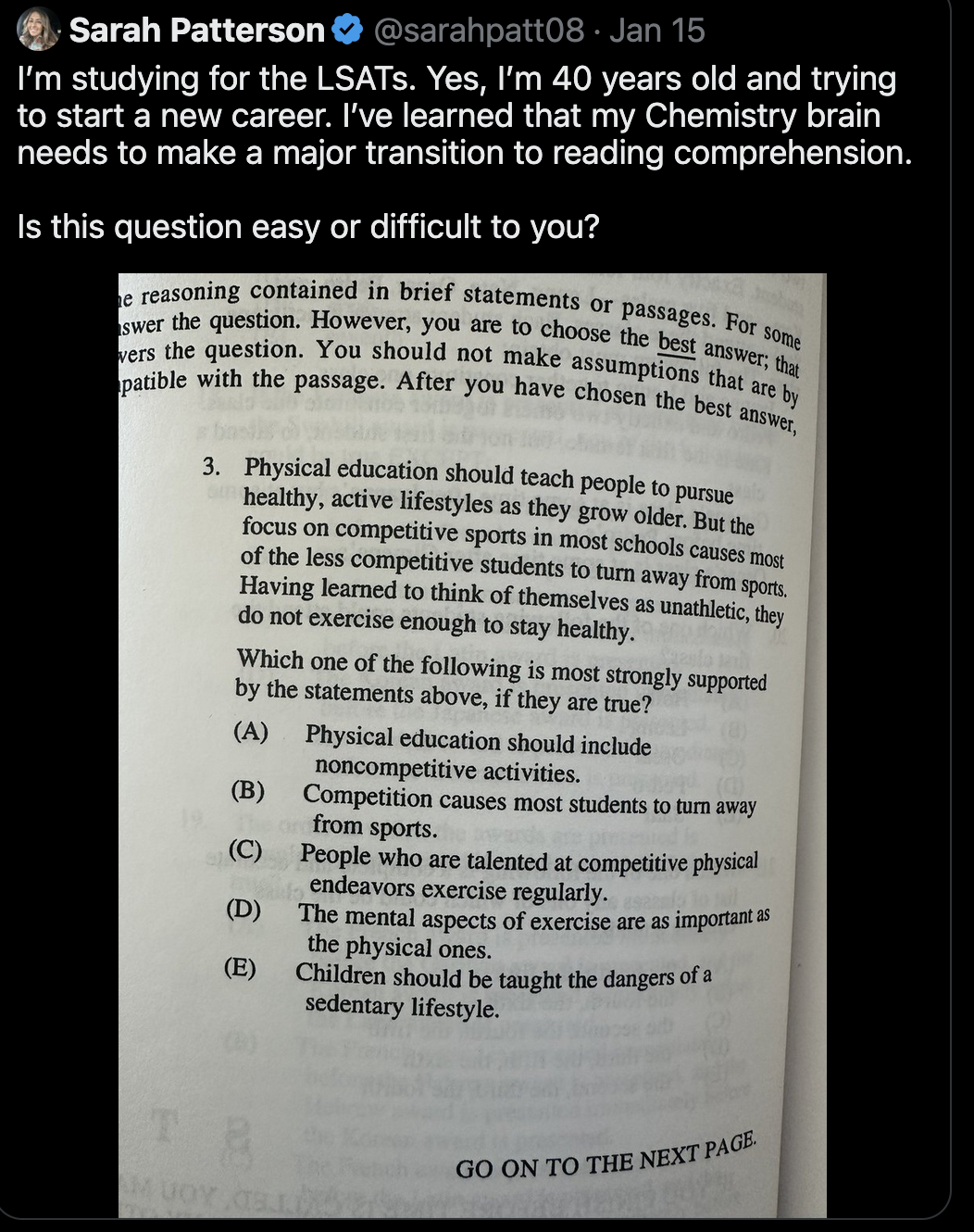 A Plus February 13, 2025, 1:40 AMFebruary 13, 2025, 1:40 AM Chill Killin' It Super easy. Itโs A. Took me 12 seconds. No other answer is even remotely possible. Iโd never want to be a lawyer, but Iโd nuke the LSAT so hard Iโd be accused of cheating (has happened to me a lot).