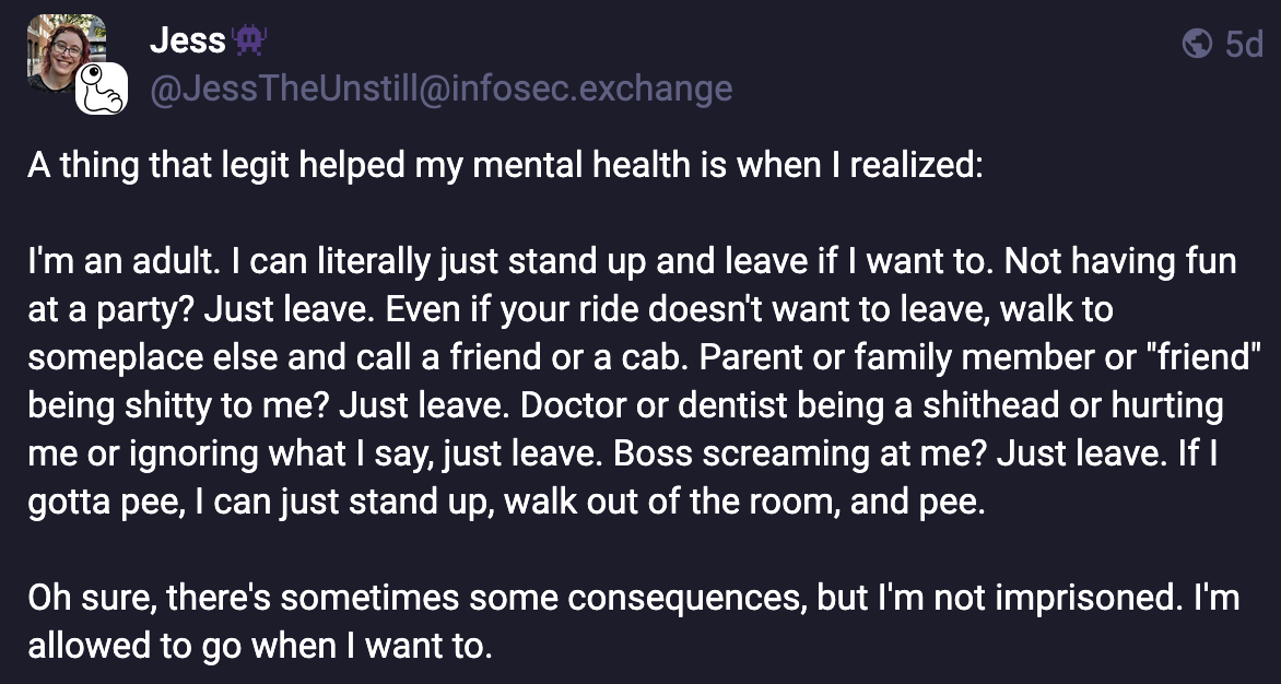 I realized this too pretty early. If youโre willing to accept the consequences (and I am), you can do whatever you want. I donโt want to be in a meeting? I leave. Someoneโs abusing me? Just walking out works fine. Just try to stop me. Youโll find out what โworld of hurtโ means.