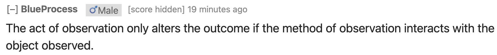 The reality is that any measurement is an interaction. Even in cases where thereโs no obvious physical disturbance (like a photon bouncing off an electron) the act of determining the state of a quantum system is itself a measurement. Please take this at face value: a quantum system does not have a definite state until it is measured.