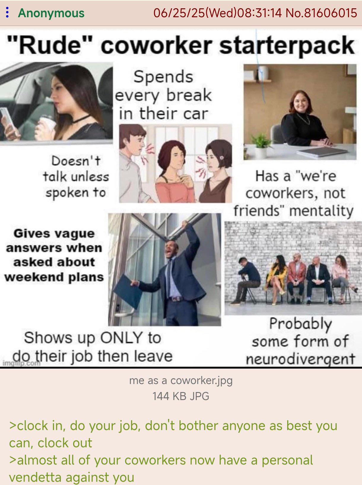 Rude Cow July 2, 2025, 2:51 PMJuly 2, 2025, 2:53 PM Chill Regular-ass Post I am usually (almost always) this “rude” co-worker. My rule is that no one at work needs to know anything about me that is not strictly necessary to do my job or theirs. And that credo has served me quite well.