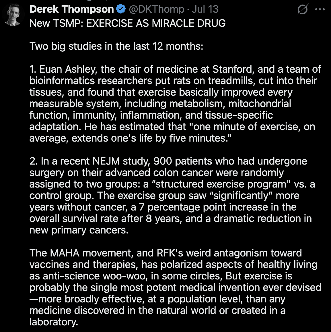 Drugless Miracle July 14, 2025, 3:49 PMJuly 14, 2025, 3:49 PM Chill Cool I did my own analysis several years ago and came up with similar number to the first point. I calculated that one minute of exercise extends your life by 5-9 minutes with 95% CI. Good to see someone do it more formally.