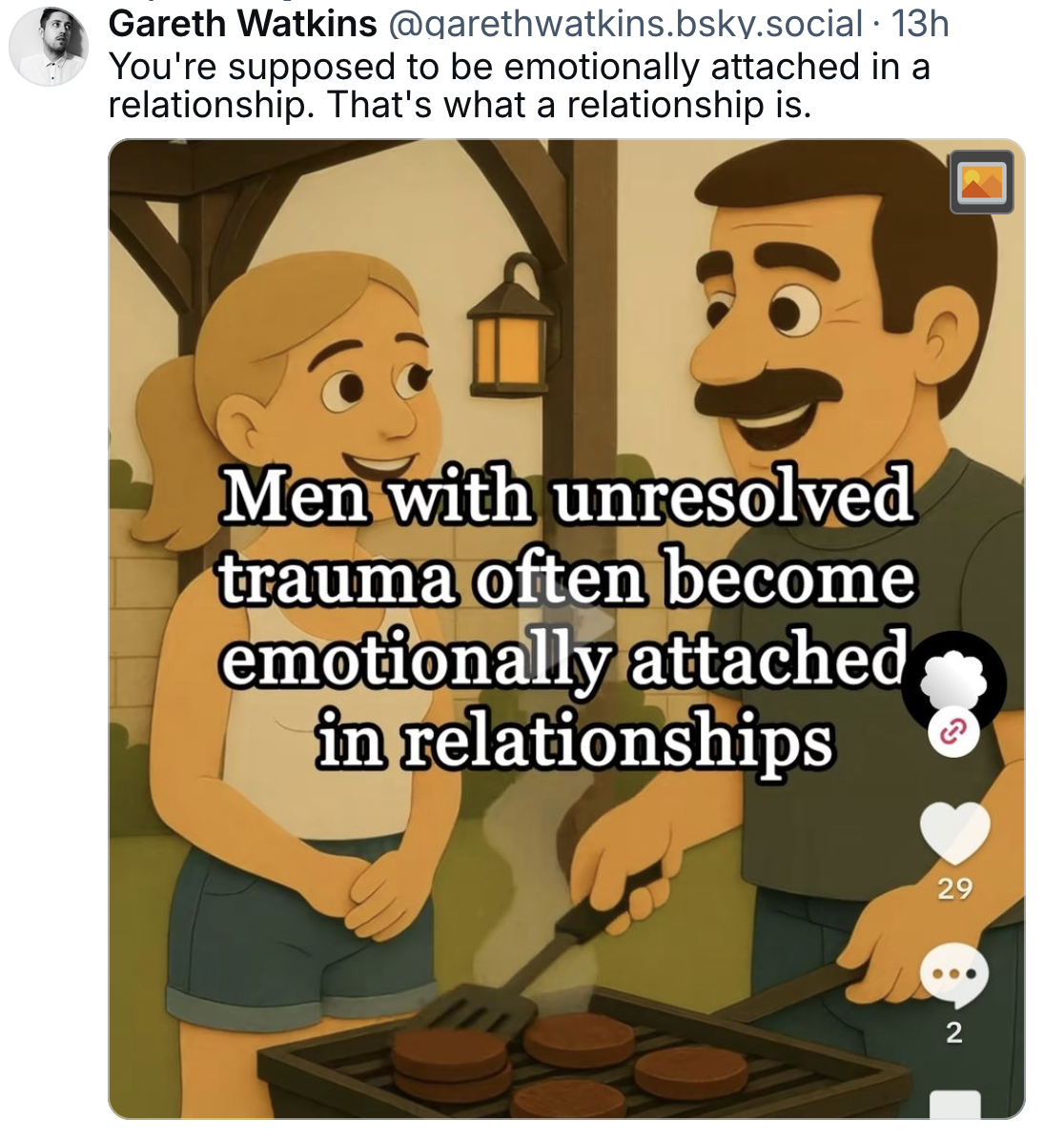 A couple of things going on here, though. Many women don’t believe men actually feel emotions. This headline was probably written by one of those types. And Gen Z believes that all relationships are about power and any emotions are secondary (if considered at all) to that. So this was probably written by a 28ish-year-old Gen Z woman in a large blue city. They are the main purveyors of this kinda shit.