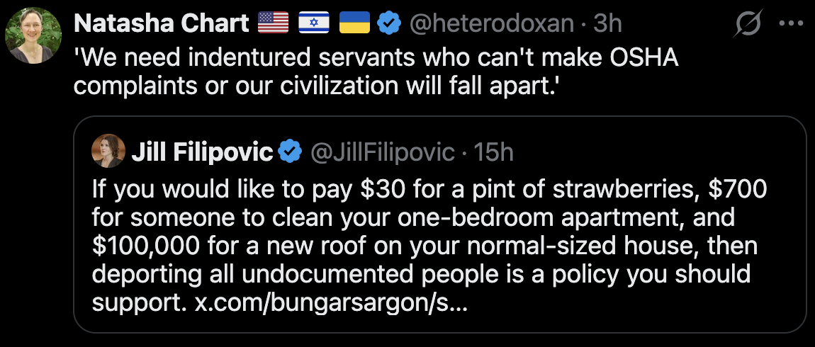 Ha, for sure, so much of the “progressive” argument for immigration is, “It’s not gonna be me wiping Nana’s bum in the nursing home! I need Lupe to do that!”