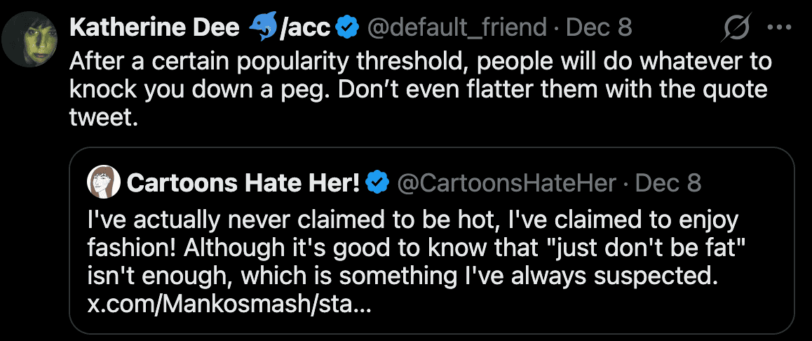 Also, no, not being fat is not enough to be hot. It’s just the bare minimum to have a chance. Taking care of yourself otherwise (dressing well, no tattoos, hair maintained) and attitude are what else matters.