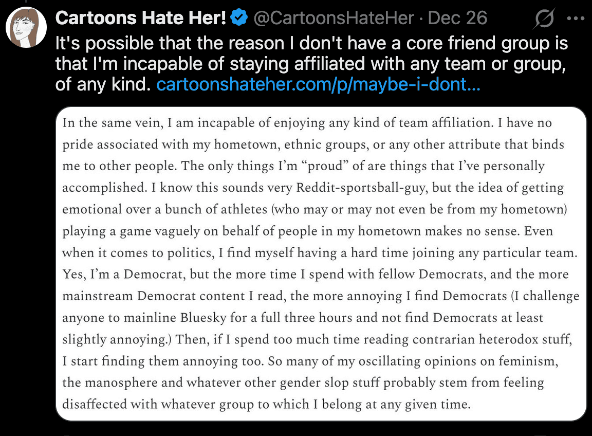 Same. I am naturally repelled by groups, do not like hanging out other than 1:1, and have no interesting in cheering for any team or group, etc. Thatโs just not for me. It actually works really well for me that all my friends are singletons in cities all around the world โ no possibility of a friend group.