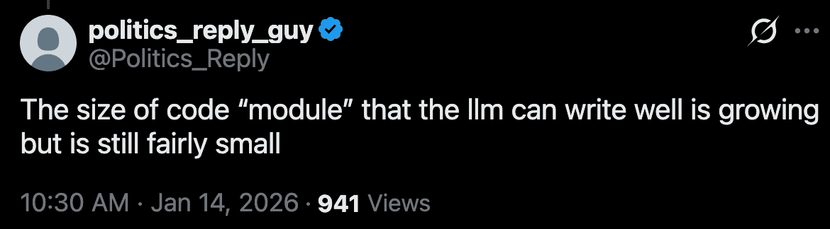 Correct. Iโve found ChatGPT chokes after about 10,000 lines of code. Beyond that, youโd have to start modularizing stuff a lot. I have little interest in doing that, so Iโve mostly restricted what Iโve done to smallish projects. One day Iโll take on a bigger one, but in the main Iโm not interested in being a programmer with or without AI.