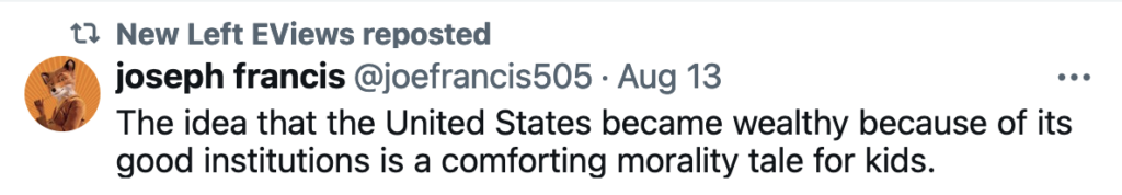 The US didnโt become wealthy because of its good institutions, but it also did not become unwealthy because of its institutions. Which is how many states do it, such as Venezuela and much of the rest of Latin America. Thatโs also important and it is equally childish to believe otherwise.