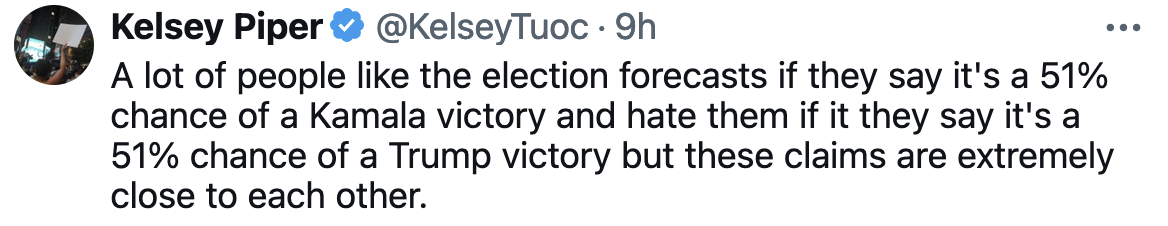Itโs striking how dense more-cerebral people like Kelsey can be sometimes. Most people are not statisticians and have no coherent way of thinking about polls or how the numbers are determined post-polling. Also, correctly, the hoi polloi recognize that no claim like this is made without a political dimension. Therefore depsite being statistically nearly-indistinguishable, Trump at 51% vs. Harris at 51% is also a potentially political claim about the future.