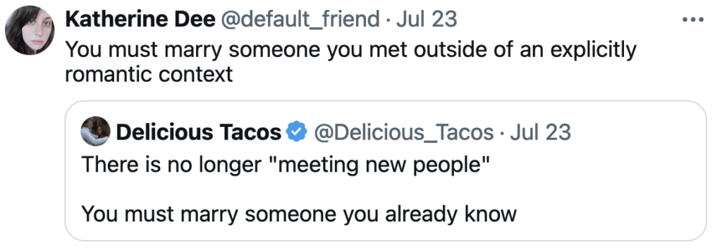 Isnโt that some weird shit? To younger millennials and Gen Z, anything to do with a romantic context for meeting is invalid and โharassment.โ Itโs no wonder they donโt have kids; they donโt understand romance, donโt have sex, and think being attracted to the person youโre with is some sort of insult.
