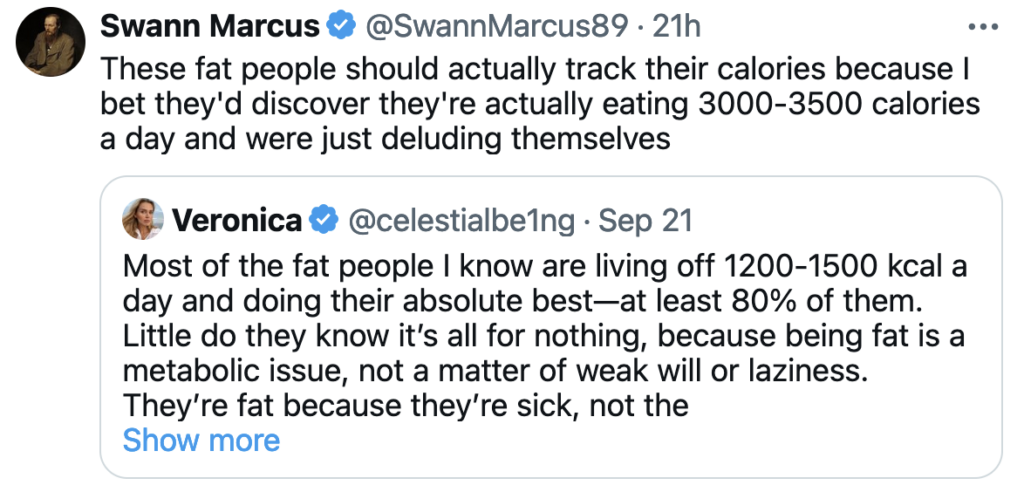 People can be really, really deep into self-delusion. Nearly everything everyone reports about how much food they consume is a lie โ and especially the obese.