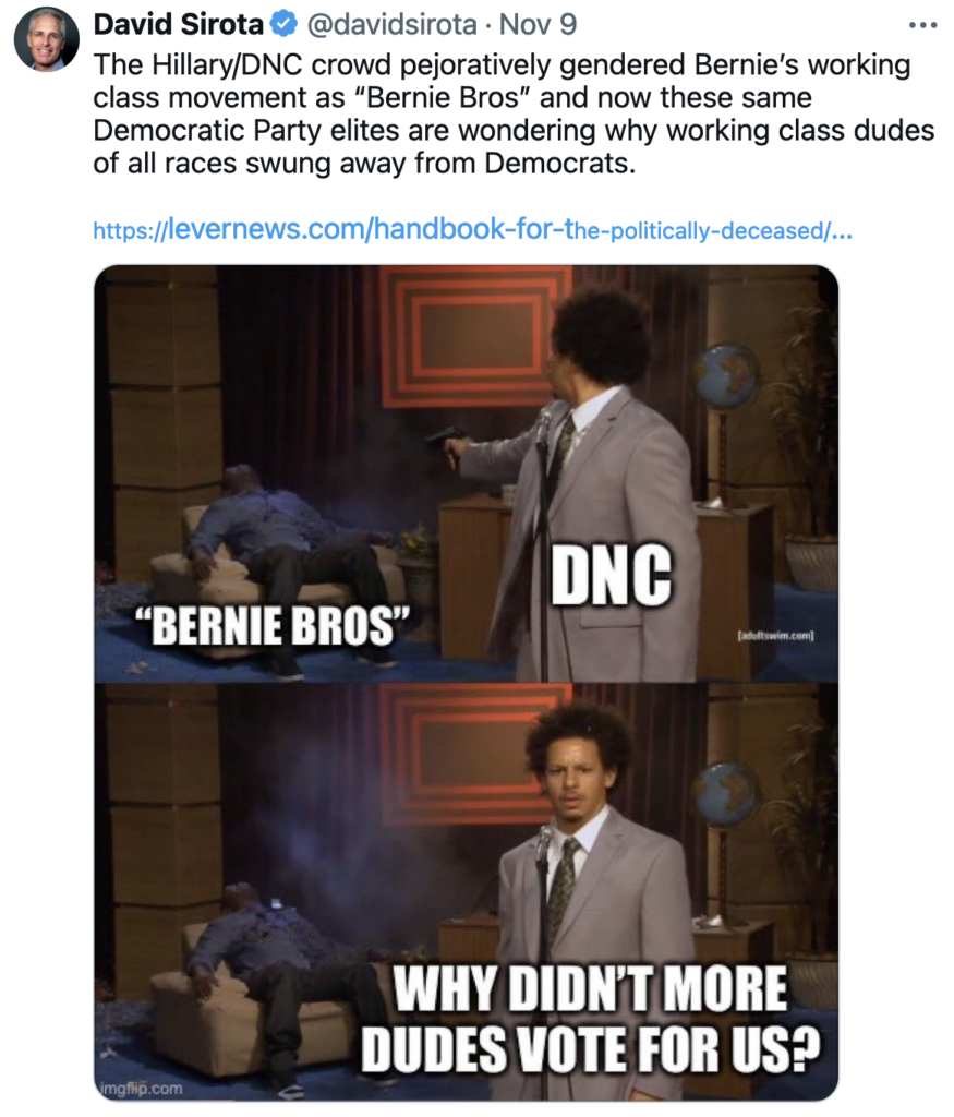 Thatโs right. Also, when Hillary was running if you were anything less than insanely supportive of her you were called a โBernieBro.โ I voted for Hillary in 2016, by the way. I still got called a โBernieBroโ numerous times because I said she was a widely-disliked candidate the Dems shouldโve never run and that no one deserves to win. That they have to earn it. Hillary supporters went absolutely batshit about this.