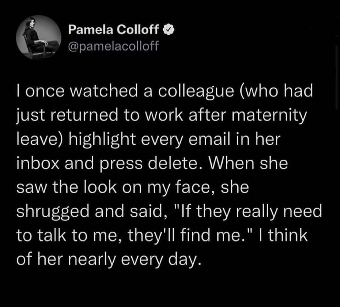 I was not on maternity leave obviously, but I did the same thing after a two-week vacation on a job that I’d grown increasingly frustrated with. There, I’d get 500-1,000 emails a day. I rolled back in, took one look at my inbox, and deleted every single thing in there. There were no consequences other than not having 10,000+ emails to deal with.