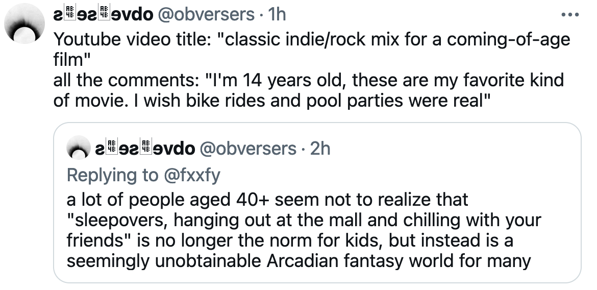 But it did. In important ways, it was a lot freer — there was far less surveillance. Kids were allowed to roam, and have their own lives. There was no social media (except BBSes, which few used). I would not want to go back, but this is one of the few examples I’ve ever found of what it felt like to live in that time. I knew kids just like this dude and his friend who did things just like they are doing in the video.
